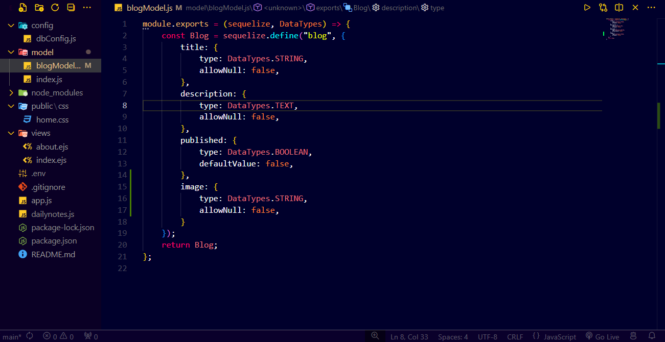 The blogmodel.js file defines a Blog model with fields for title, description, and published. The sequelize.define method is used to create the table with these fields and their respective data types.